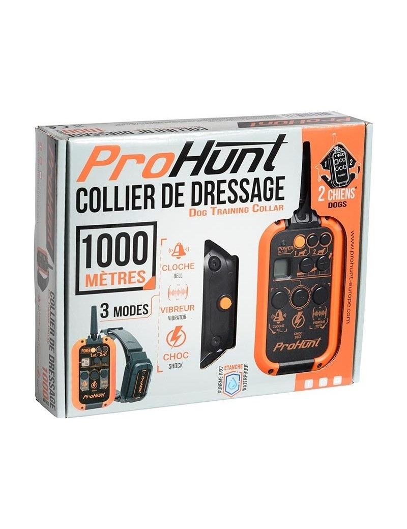 Le collier de dressage 1000m de ProHunt est un collier de dressage qui, comme son nom l'indique, possède une porté maximale de 1000 mètres (en terrain ouvert). Très polyvalent, ce collier possède 3 modes de stimulation : bip, vibration et stimulation électronique à 16 niveaux. Facile d'utilisation et intuitive, la télécommande permet de contrôler jusqu'à 2 chiens en même temps, il suffit pour cela d'acheter un collier supplémentaire. L'appairage se fait facilement grâce aux instructions de la notice. Le collier et la télécommande sont étanches selon les normes IPX7 et IPX5. Très pratique, l'ensemble est rechargeable pour ne jamais vous laisser à court de piles.