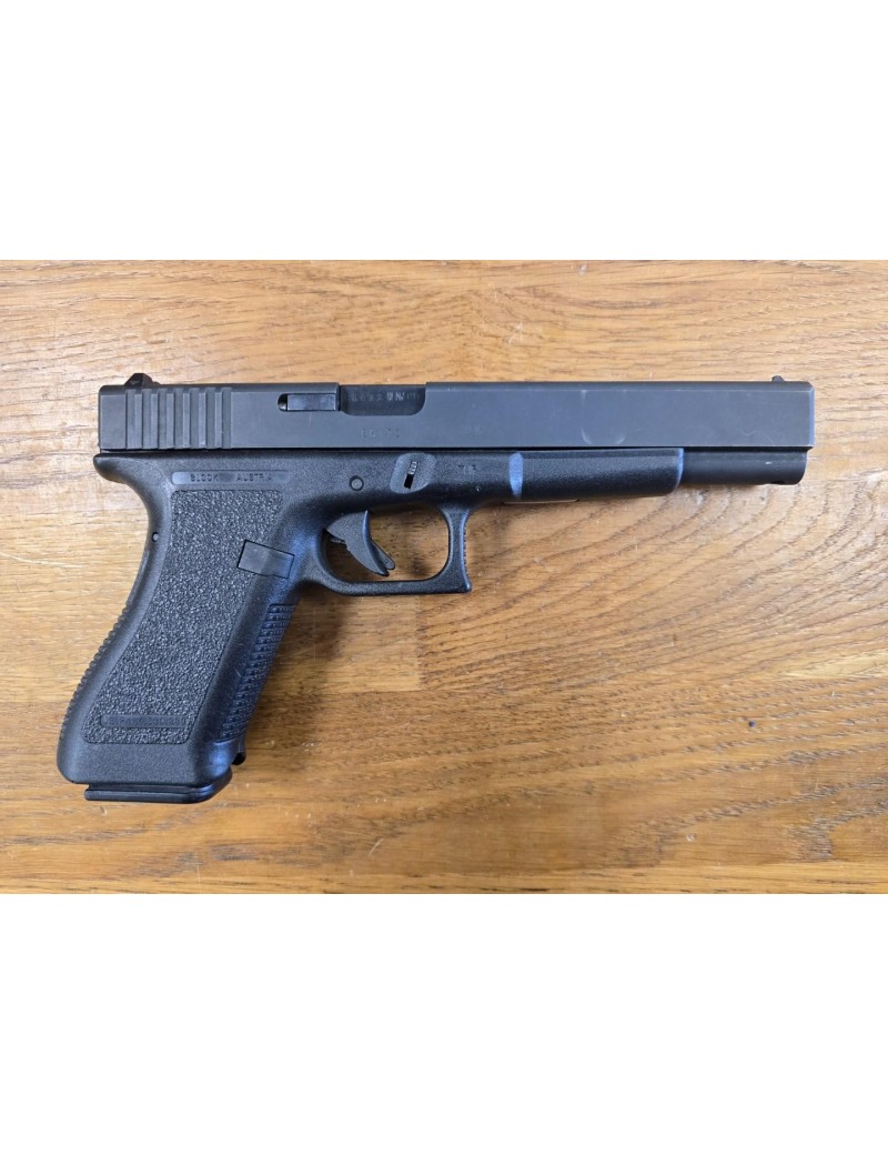 Pistolet Glock 17L de calibre 9x19mm Para. Il possède un canon de 15cm.