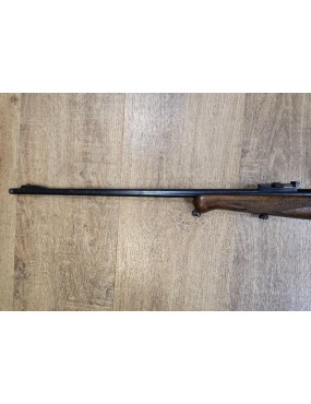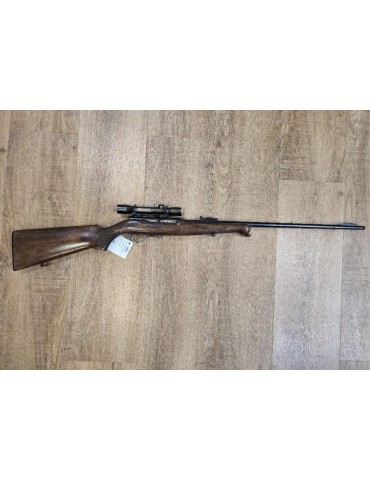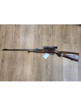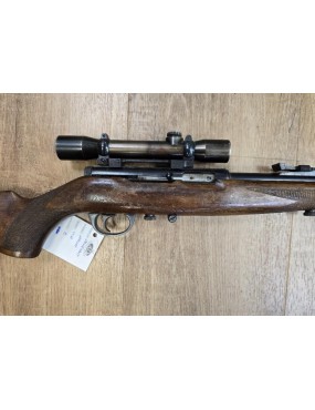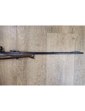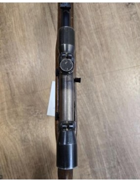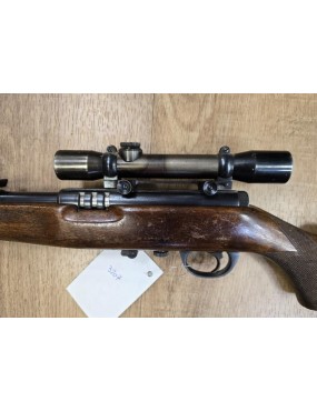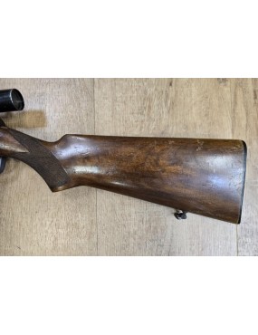 Arme en bon état, éclat au niveau de la poignée de crosse et rayures sur le bois. Livrée avec sa lunette et son montage. Pas de chargeur.