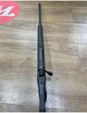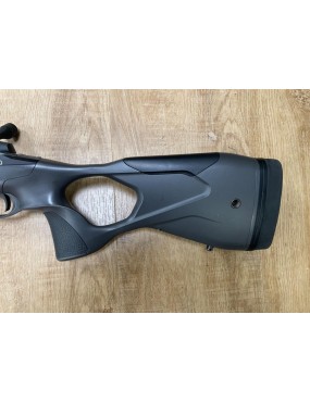 L'arme en synthétique est destinée aux droitiers et dispose d'une crosse de 36cm avec trou de pouce et busc réglable.