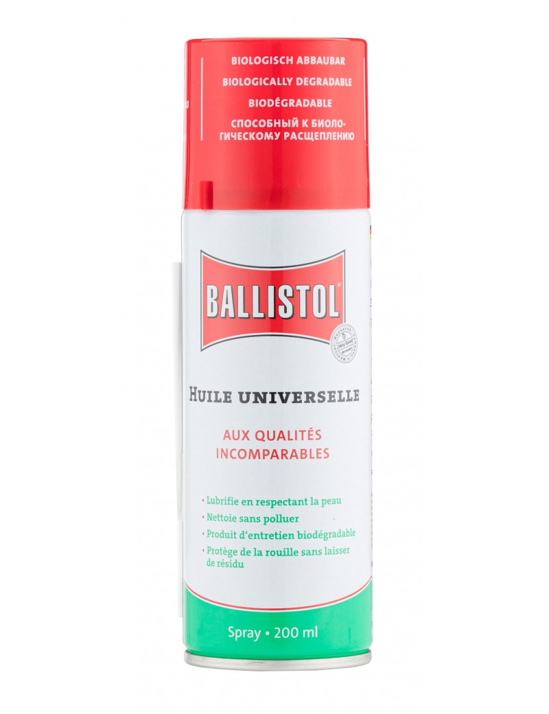 Ballistol protège de la rouille, lubrifie, nettoie, et agit sur les résidus de poudre, les dépôts de plomb, de cuivre et de tombac. Il pénètre dans les plus petites fissures, dissout les résidus et résines provenant de l'usage d'huiles inadéquates. Il neutralise les résidus acides de combustion. Idéal pour le soin, la récupération et l'imprégnation des fûts en bois et des bretelles en cuir.