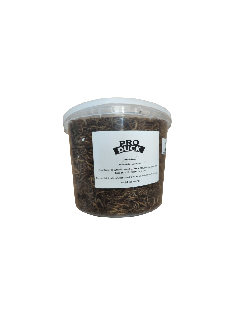 Mode d’emploi : Donnez des vers de farine en complément d’un aliment complet, plusieurs fois par semaine et dès le stade caneton, soit en saupoudrant l'aliment complet, soit directement dans les bassins.
