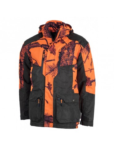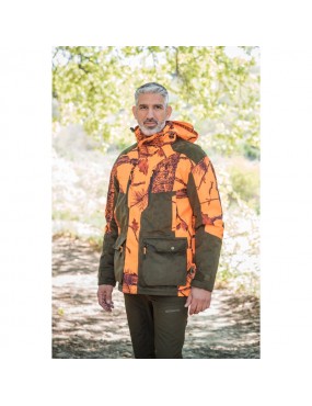 Veste de poste Blizzard. Epaisse en camouflage orange et suedine. Membrane imperméable et respirante, les coutures sont soudées. Repose mains, double poche poitrine zippées. 2 grandes poches à rabat avec 2 poches zippée contenant 2 cartouchières MSS system. Poches portable et permis intérieur. Capuche amovible et carnier zippé.